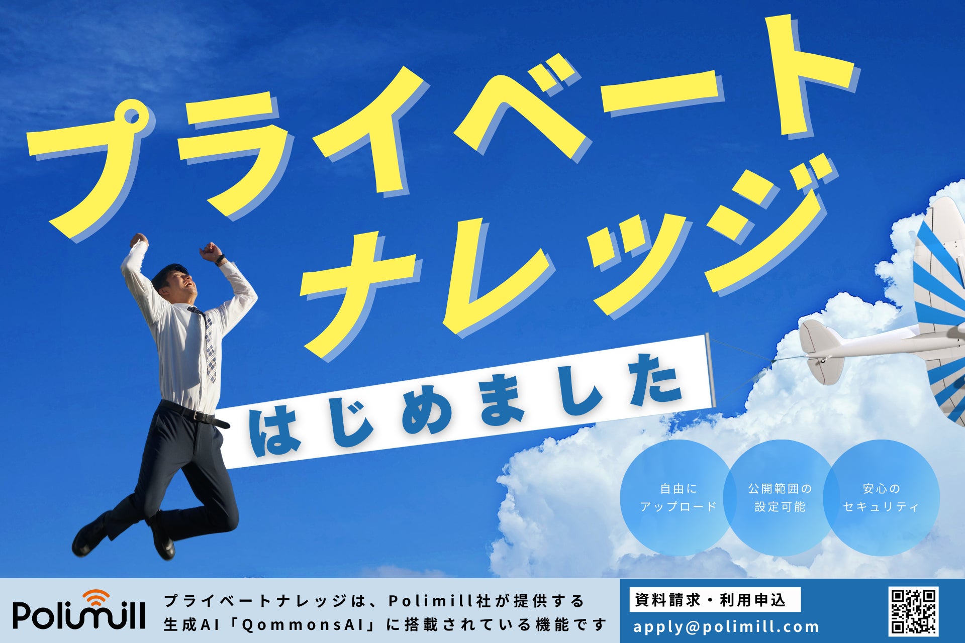 生成AIの社会実装をリードするPolimill株式会社(本社:東京都港区、代表取締役:横田えり)は、省庁・自治体向け生成AI「QommonsAI」に新機能『プライベートナレッジ』を追加しました。この新機能は、自治体業務に必要な資料やデータを安全に管理しながら、AIとの対話を通じて、それらを活用した意思決定や政策検討を迅速かつ的確にサポートすることを目指しています。