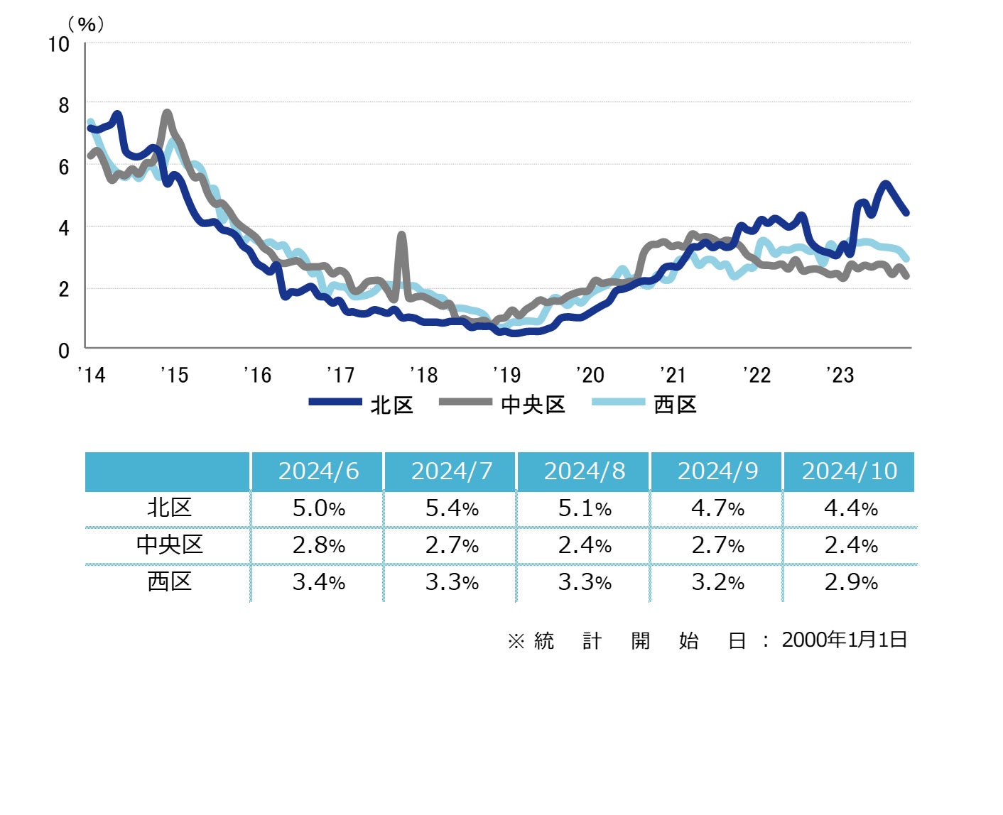 空室率は前月比マイナス0.27ポイントの3.14%となった。3ヵ月連続の低下で、2%台が視野に入りつつある。今年竣工した新築ビルを中心に、立地やビルグレードの改善を目的とした移転により空室床の消化が進み、主な低下要因となっている。潜在空室率は前月比マイナス0.14ポイントの4.93%と、2023年12月以来の4%台となった。