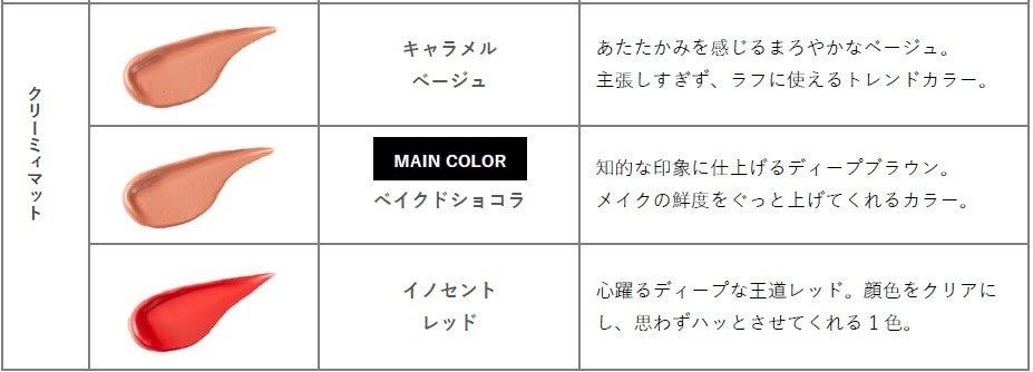 【クリーミィマット】:キャラメルベージュ/ベイクドショコラ/イノセントレッド