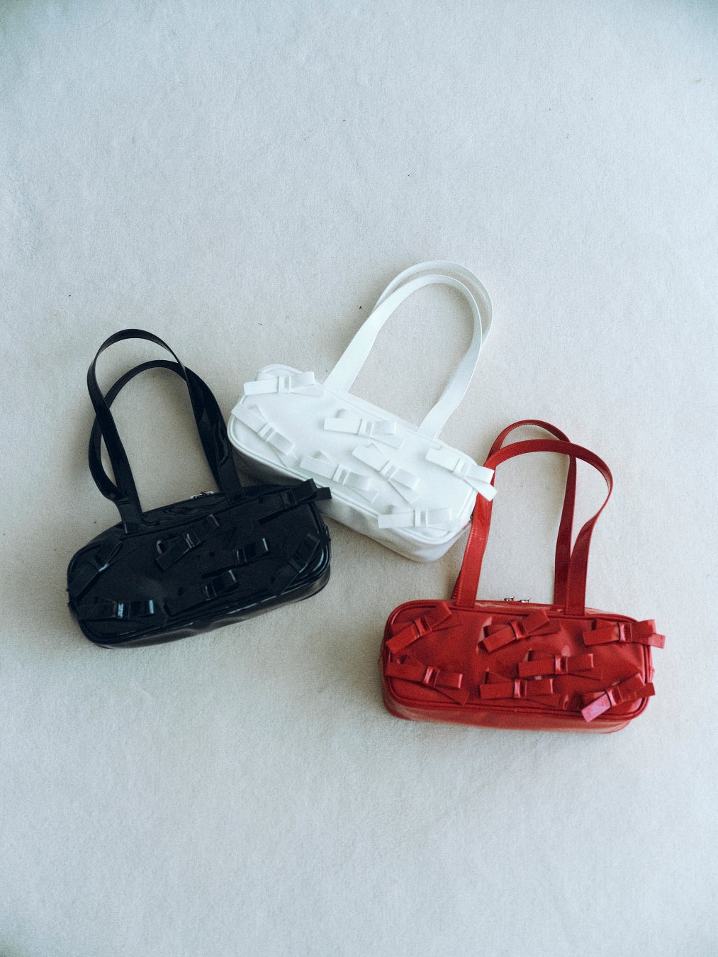 立体的なリボンを散りばめた、エナメル素材のボストンバッグです。女性らしいフォルムと個性的な横長デザイン。