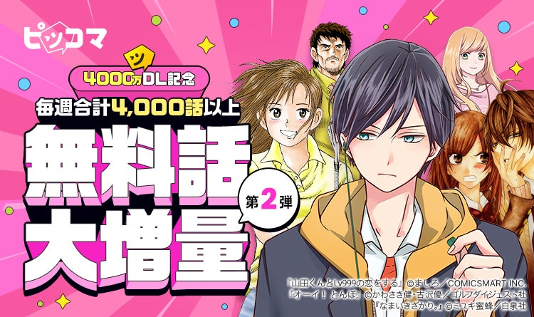 ピッコマアプリ・ピッコマWEB両方が対象となる、本イベントの第2弾では現在テレビアニメが放送中の『山田くんとLv999の恋をする』(KADOKAWA)や、不朽のゴルフマンガ『オーイ!とんぼ』(ゴルフダイジェスト社)、バスケ部ラブコメの『なまいきざかり。』(白泉社)などのタイトルが6/15(木)〜6/21(水)の期間、4,000 話以上増量されます。