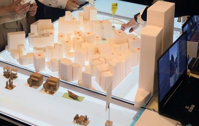「Tangible Interface XR」は、建築物の評価に利用される都市模型(ジオラマ)とVRによって、都市デザインをインタラクティブに行えるツールです。台上の都市模型の形状と配置を、実寸大の3Dデジタルツインの景観として再現し、人物や調度品の模型を合わせてVRヘッドセットやディスプレイに表示することができます。