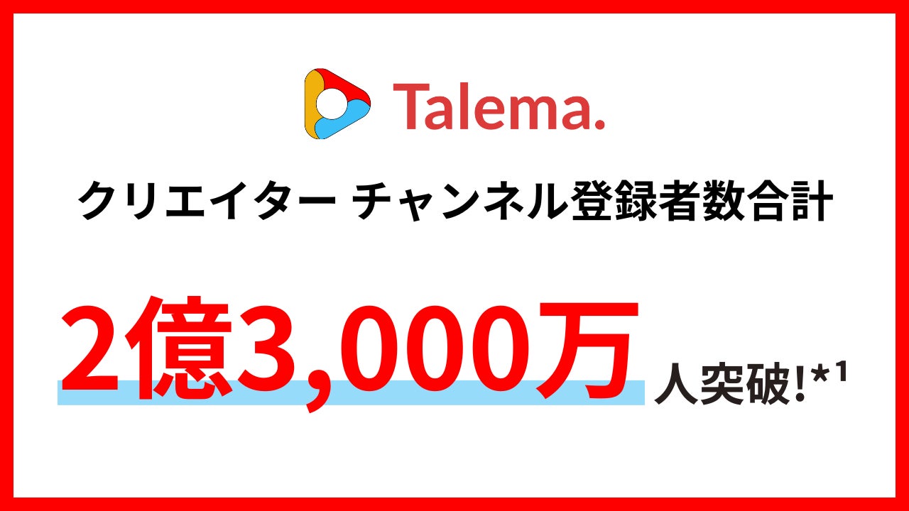 株式会社アイズ(所在地:東京都渋谷区、代表取締役社長:福島範幸、東証グロース:5242)が運営するYouTube案件のマッチングプラットフォーム「Talema.(タレマ)」に登録しているクリエイターのチャンネル登録者数が、合計2億3,000万人を突破しました。*¹