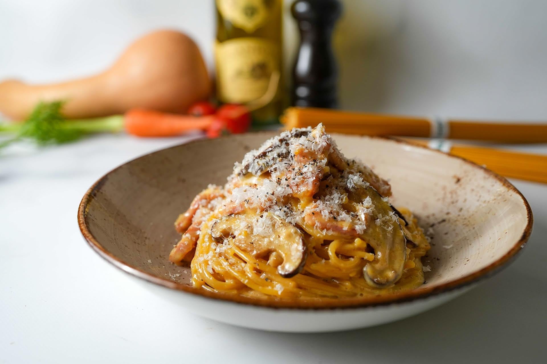 岐阜県産の有機椎茸と国産ベーコンをじっくりソテーし、旨味を最大限に引き出した季節のカルボナーラ