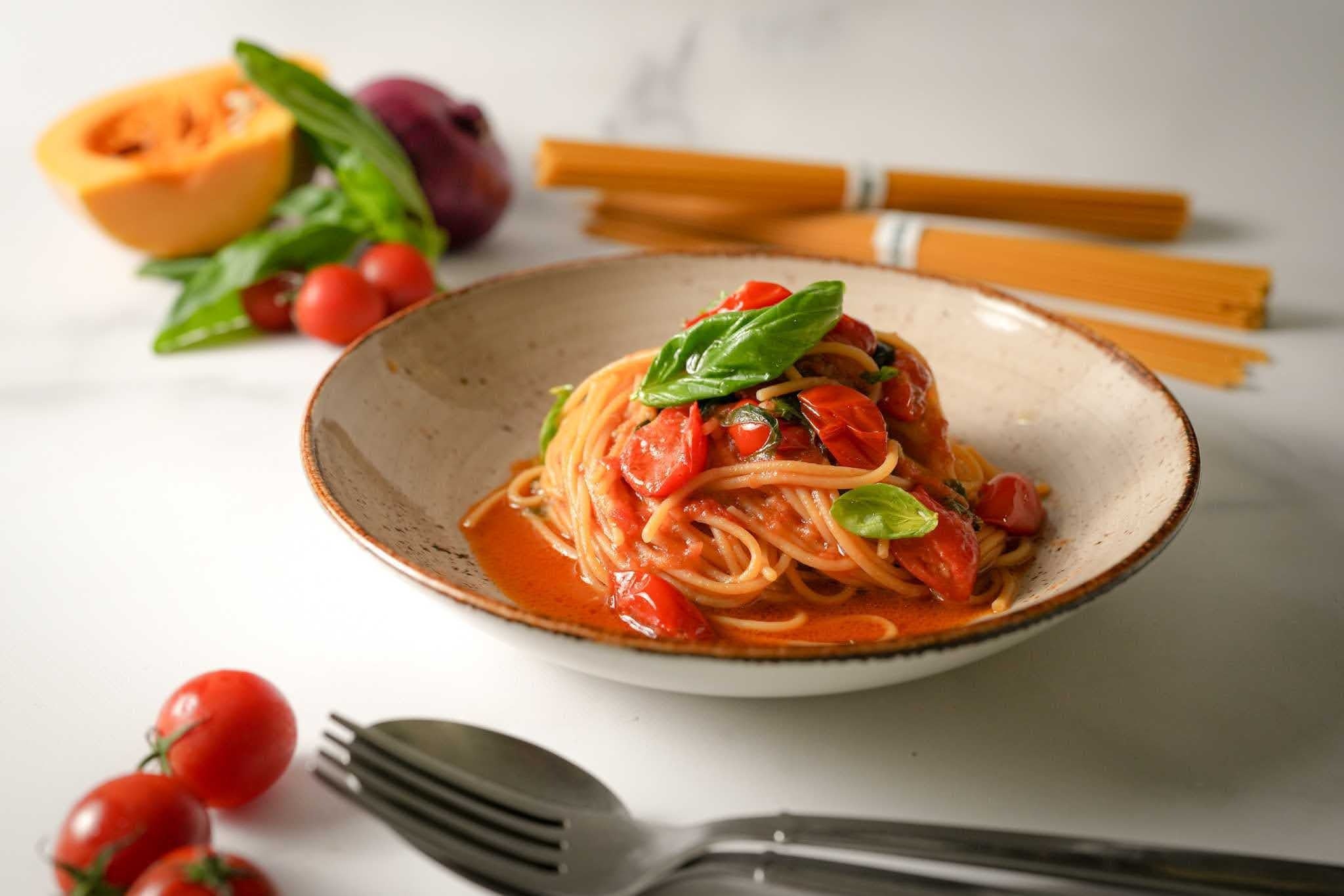 チェリートマトの甘みと酸味、ニンニクの香り、フレッシュバジルのさわやかさを調和させたnishの人気シグニチャーソースです。