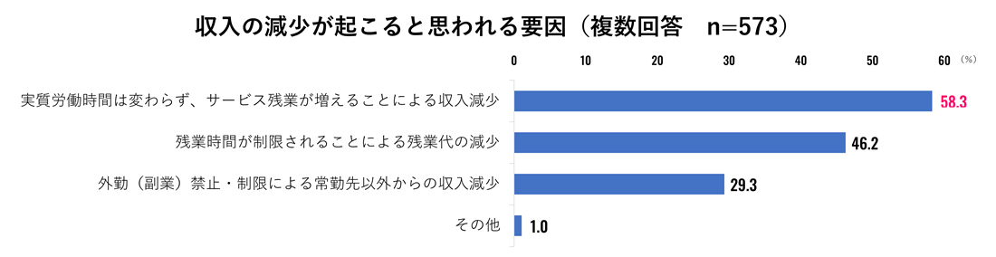 収入が減少すると思われる要因は「サービス残業が増えることによる収入減少(58.3%)」