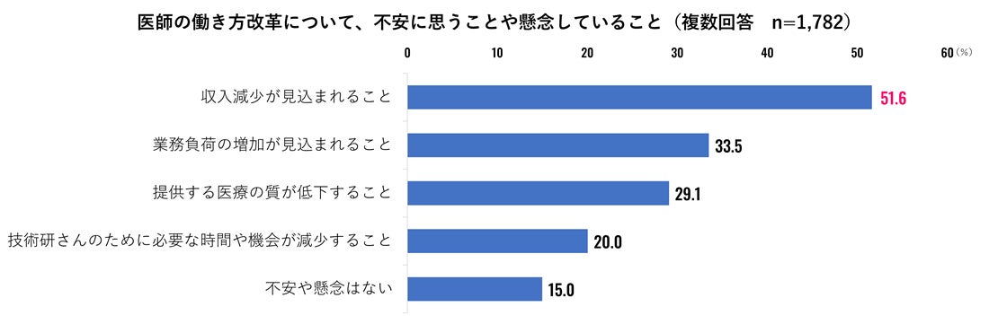 医師の働き方改革への不安や懸念は「収入減少が見込まれること(51.6%)」