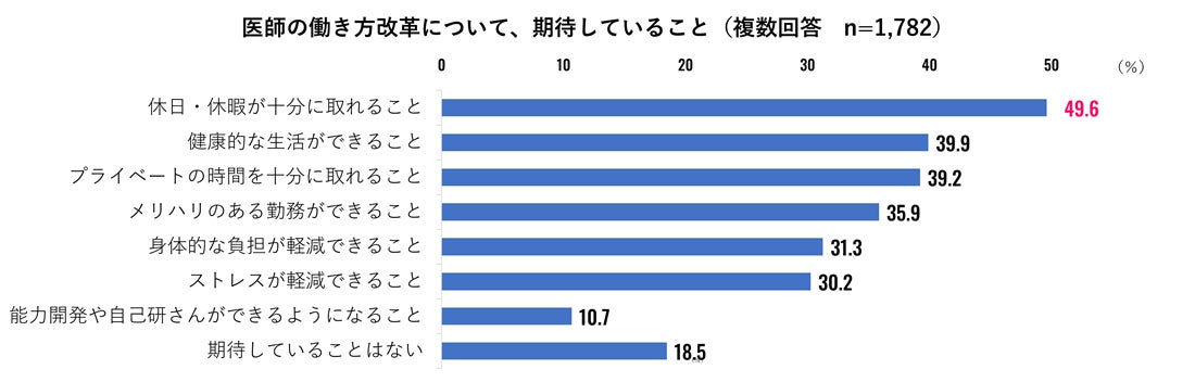 医師の働き方改革について、期待していることの最多は「休日・休暇が十分に取れること(49.6%)」