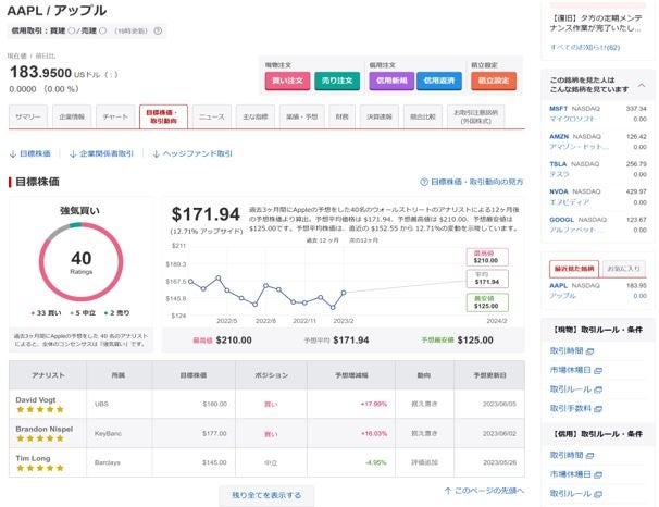 アナリストの予想コンセンサス(「買い」、「中立」、「売り」など)や、複数名のアナリストが評価した目標株価の平均の推移をチャートで確認できます。