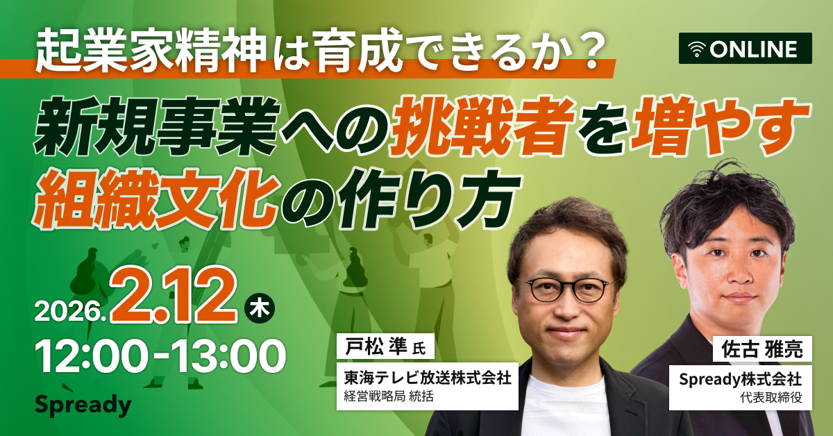 東海テレビ放送株式会社(本社:名古屋市東区)は、Spready株式会社と共同で、2026年2月12日(水)にオンラインイベント「新規事業への挑戦者を増やす組織文化のつくり方」を開催いたします。
