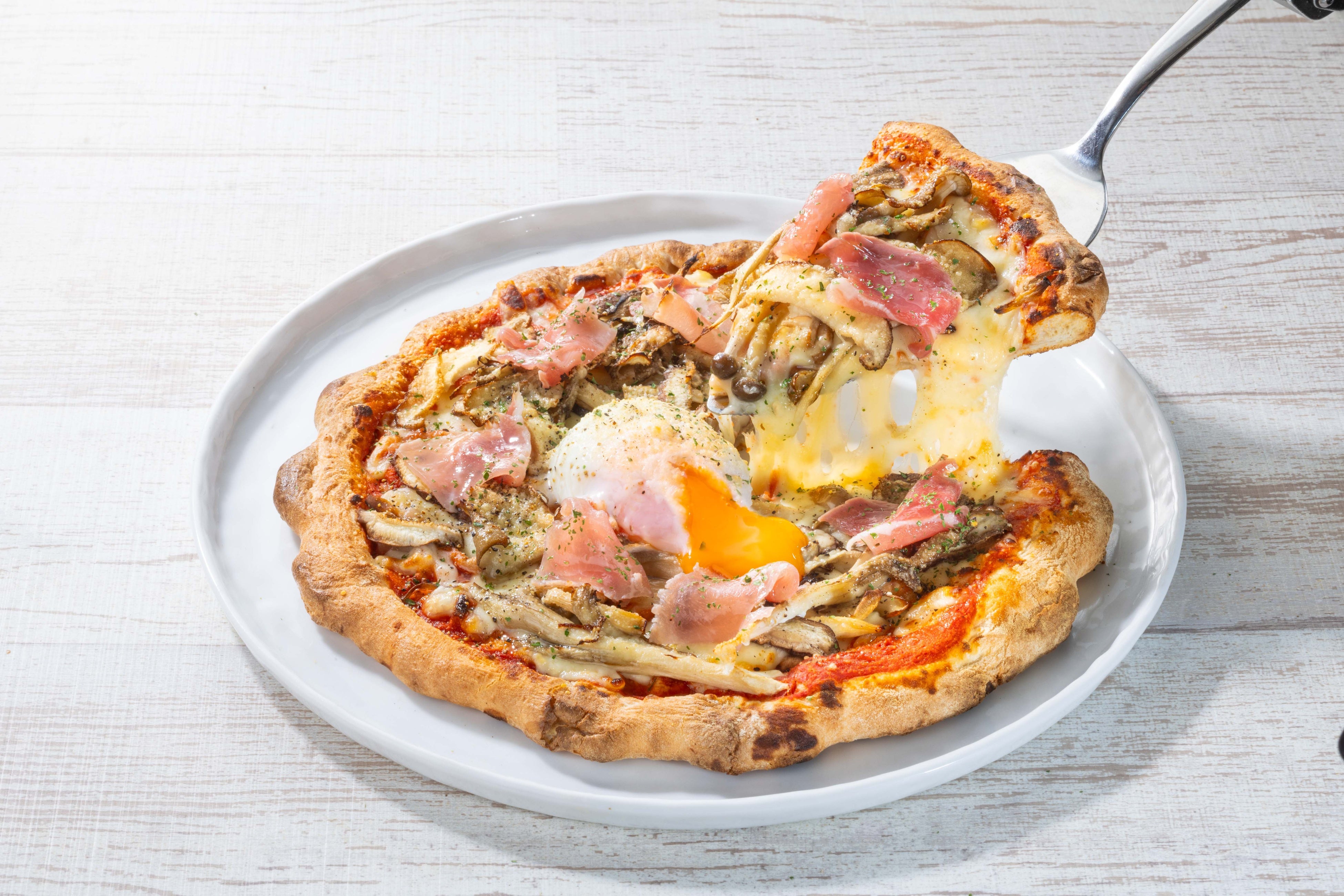 「3種のきのこ」に炙り生ハム、温泉卵をトッピングいたしました。