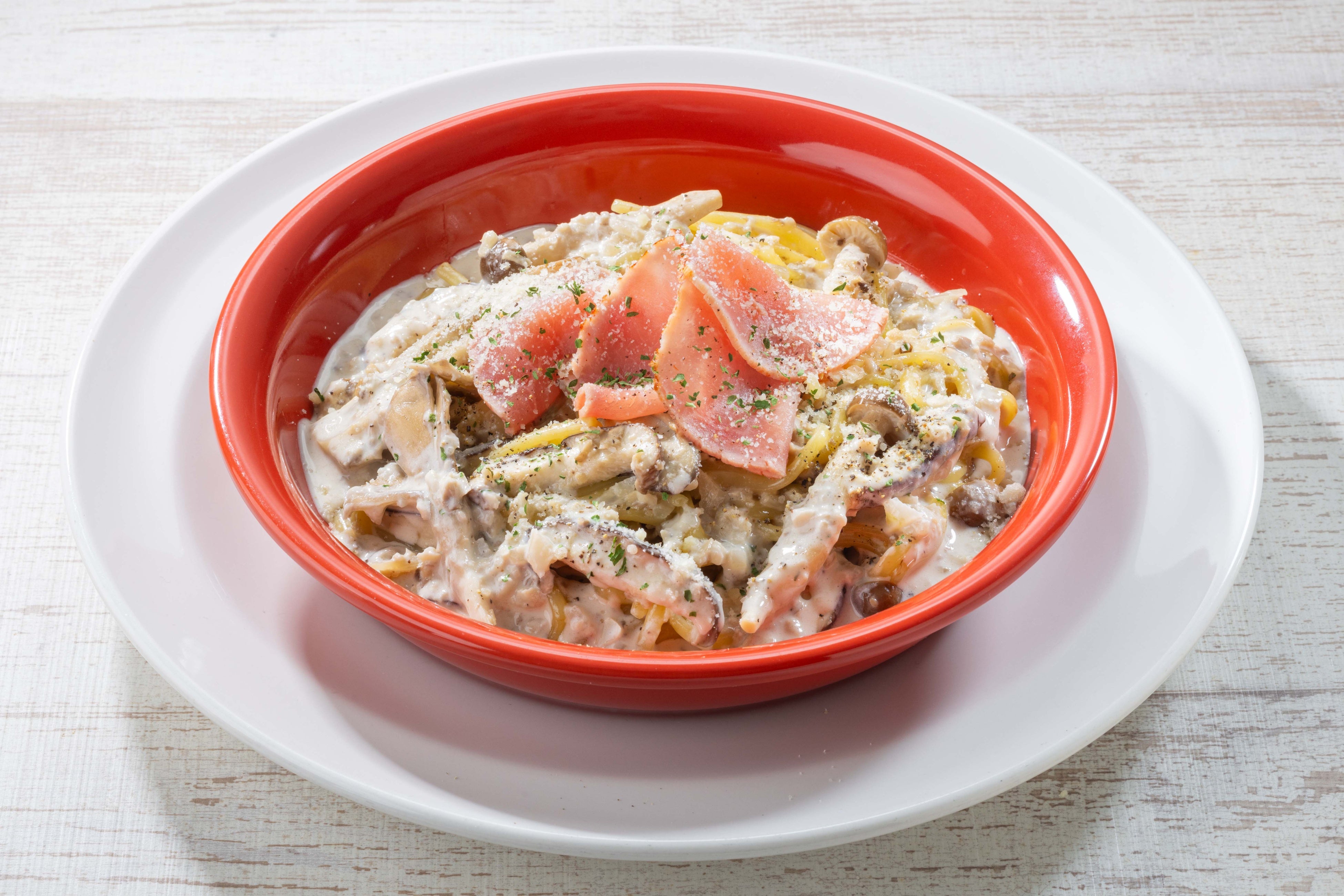 デュクセルソースと生クリームベースで濃厚なクリームソースに自家製のモチモチの生パスタを合わせました。