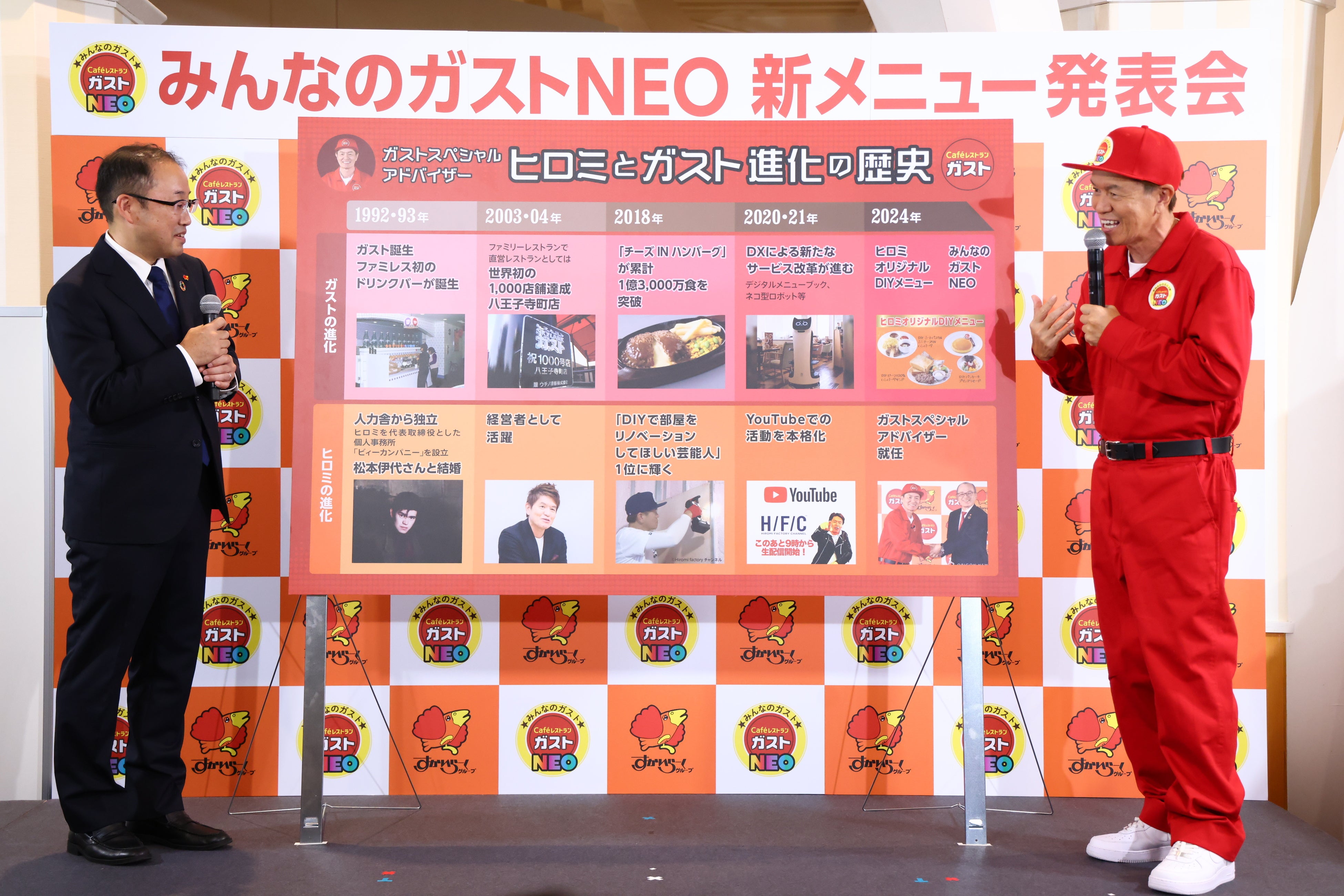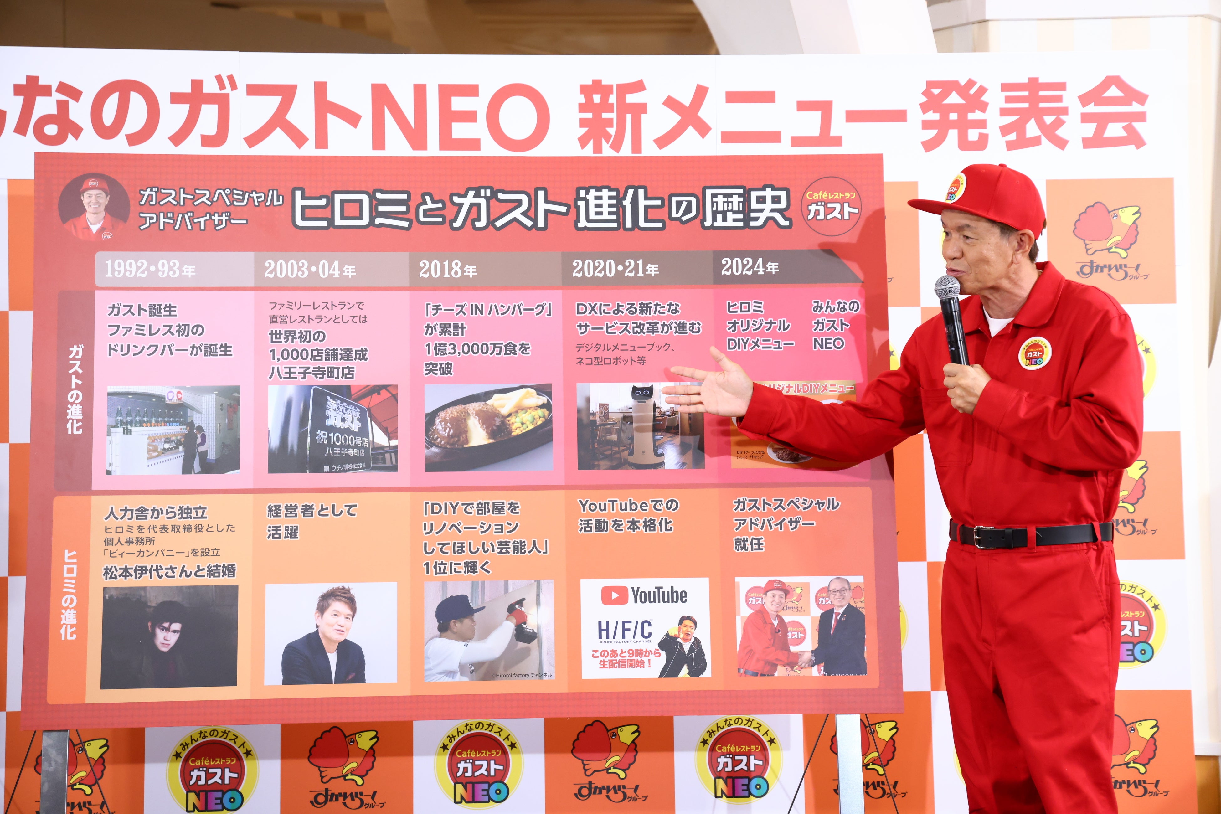 発表会冒頭では、ガスト開発グループ ディレクター六笠より「今年4月、お客様よりメニューに対するご意見を集め、それを反映したメニューをみんなのガストというコンセプトでお出ししたのが始まりです。」とみんなのガストが始まった経緯を説明。「今までにないメニュー開発に取り組んでおりますので、皆様ぜひお楽しみください。」とガストの新たなメニューへの想いを語りました。続いて、スペシャルアドバイザーのヒロミさんが「NEO」の文字が入った新しい衣装で登壇すると、「自分のDIY企画をすべて形にしてくれたのがガストなんです。ガストの良さを伝えたいなと思ってきました。」と意気込みを含めた挨拶とともに和やかな雰囲気で会がスタートいたしました。