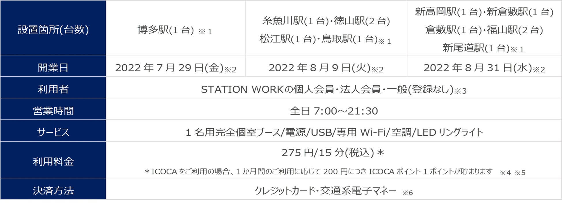 | ○東日本旅客鉄道株式会社(本社:東京都渋谷区、代表取締役社長:深澤 祐二/以下「JR東日本」)と西日本旅客鉄道株式会社(本社:大阪府大阪市、代表取締役社長:長谷川 一明/以下「JR 西日本」)は、多様な働き方をサポートするため、連携して広範なテレワーク環境の整備に取り組んでいます。 ○2022年8月31日(水)までに博多駅、福山駅、松江駅など全10カ所に、1名用個室ブース「STATION BOOTH」を順次開業します。これにより、JR西日本エリアの「STATION BOOTH」は全19カ所に拡がり、テレワーク環境がより一層充実いたします。なお、この度の松江駅、鳥取駅への設置は山陰エリア初となります。 ○これまでご利用いただいているSuica、ICOCA等に加えて、九州エリアの交通系ICカード nimoca、SUGOCA、はやかけんも入退出の鍵としてご利用いただけるようになりました。 |