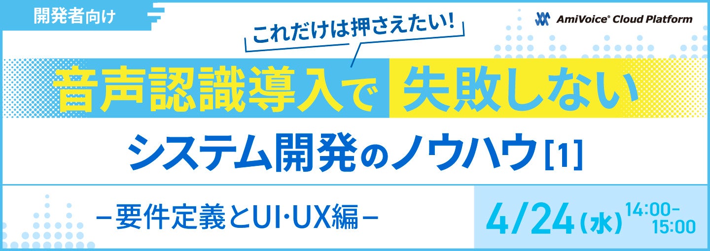 【オンラインセミナー】開発者向け:これだけは押さえたい!音声認識導入で失敗しないシステム開発のノウハウ(1)ー要件定義とUI・UX編ー【4月24日(水)開催】
