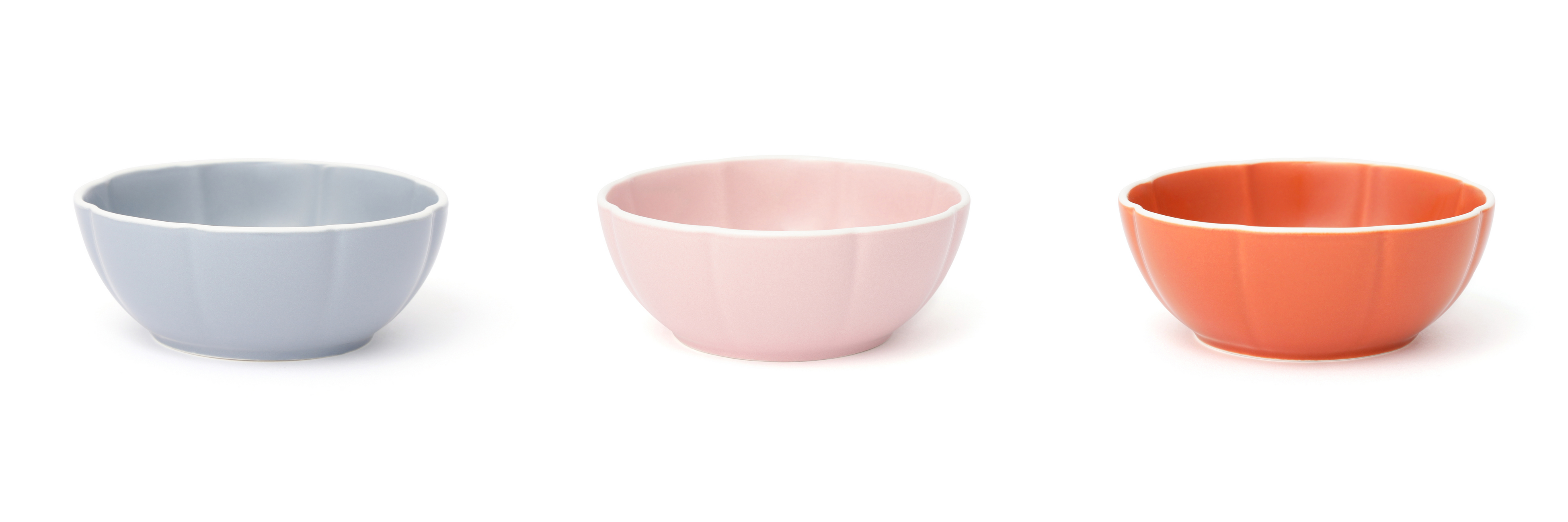 小さめサイズで、食事量を自然と意識しやすい食器シリーズです。濃いカラーが料理とのコントラストを生み、盛り付けの加減を意識しやすくなる視覚的な工夫も。お花のかたちと鮮やかなカラーで食卓をパッと明るく彩り、テーブルにお花が咲いたような華やかな雰囲気を演出します。