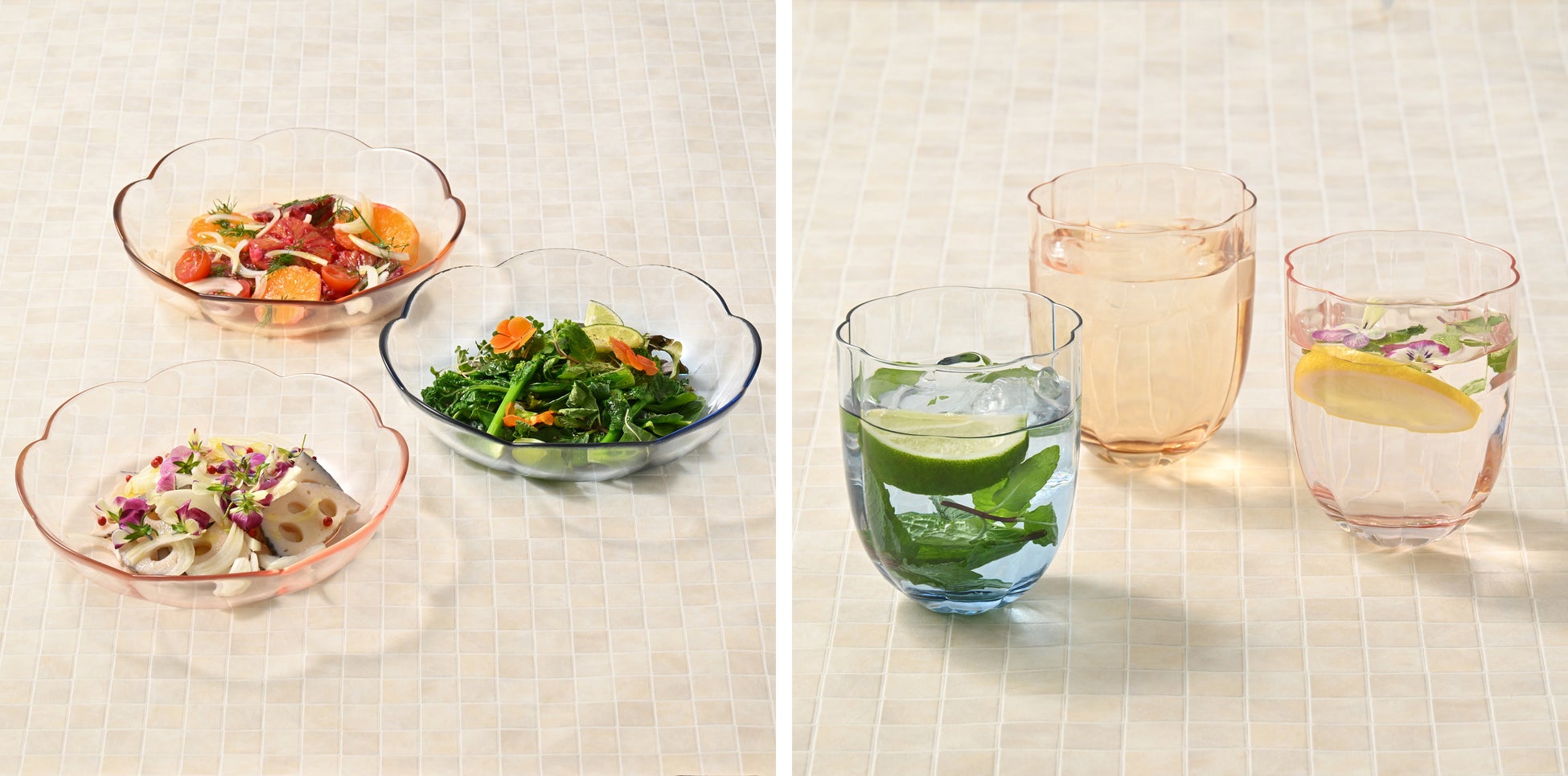 中央がゆるやかに盛り上がり、余分な油や調味料が広がりにくい「勝手にヘルシー」プレートや、100gのごはんにちょうど良いミニ飯椀、サラダやカルパッチョなどの色彩豊かなヘルシー料理をさらに美味しく魅せるガラス食器など、かたち・サイズ・色の工夫によって、食事量を意識しやすいデザインの全25点をラインアップ。 “可愛くこっそりダイエット”をテーマにした「美活」シリーズを通して、美容や健康に心地よく向き合うライフスタイルを提案します。