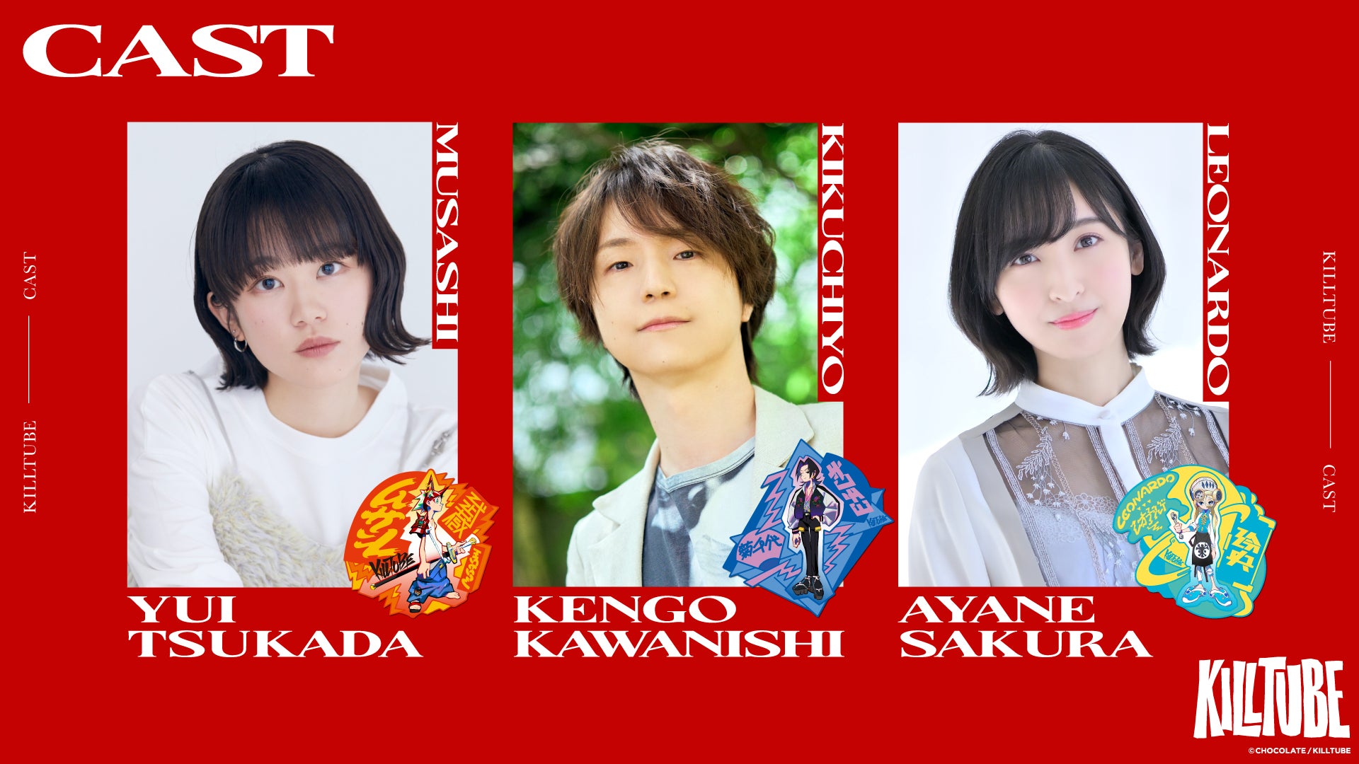 CHOCOLATE Inc.(本社:東京都渋谷区、代表取締役:渡辺裕介)は、オリジナル劇場アニメ『KILLTUBE(キルチューブ)』(監督:栗林和明/2026年完成予定)の主要キャラクター3名の声優として塚田悠衣さん、河西健吾さん、佐倉綾音さんの出演が決定したことを本日7月6日に発表しました。また、出演者3名によるコメントに加え、「鋭意開発中映像 #01」と新ビジュアルも日米同時に公開しました。海外での公開も目指す本作は、2025年7月4日〜6日で開催されている北米最大級の日本アニメ・ポップカルチャーのイベント「Anime Expo 2025」に出展し、監督を務める栗林とプロデューサー陣がトークパネルに登壇。約2,000名を収容する会場には現地のアニメファンが参加し、日米同時発表の瞬間には歓声が上がるなど、大いに盛り上がりました。