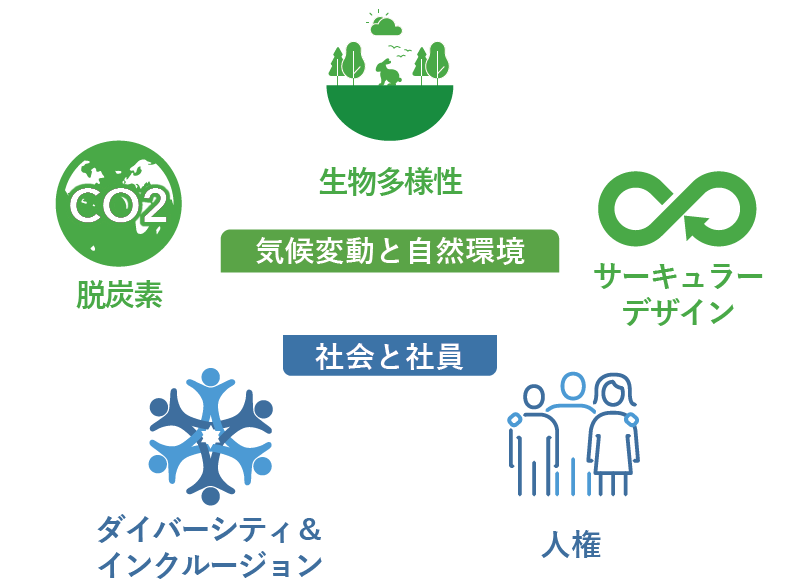 2050年のサステナビリティポリシーを実現するために、2030年までに特に取り組むべき重点課題として、「ダイバーシティ&インクルージョン」、「人権」、「脱炭素」、「生物多様性」、「サーキュラーデザイン」の5つを特定いたしました。※2
