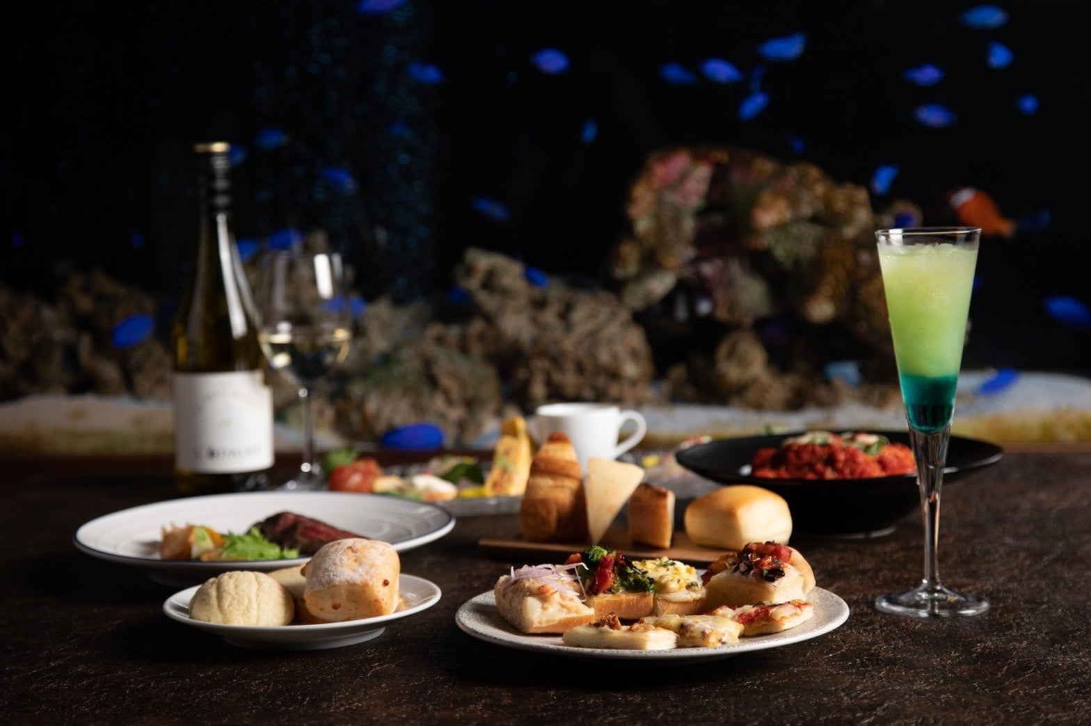 銀座コリドー街の「アクアリウムダイニング銀座ライム」では6月14日(火)より「夜のパン飲み」をスタートします。最近のトレンドは「パン飲み」。お仕事帰りに軽く一杯飲みたいというお客様のために、夜にご利用いただけるパンビュッフェをご用意しました。圧巻20mのアクアリウムを泳ぐ熱帯魚を鑑賞しながら「夜のパン飲み」をお楽しみいただけます。メゾンカイザーブレッドや惣菜パン、デザートパンまで約20種類をご用意しております。