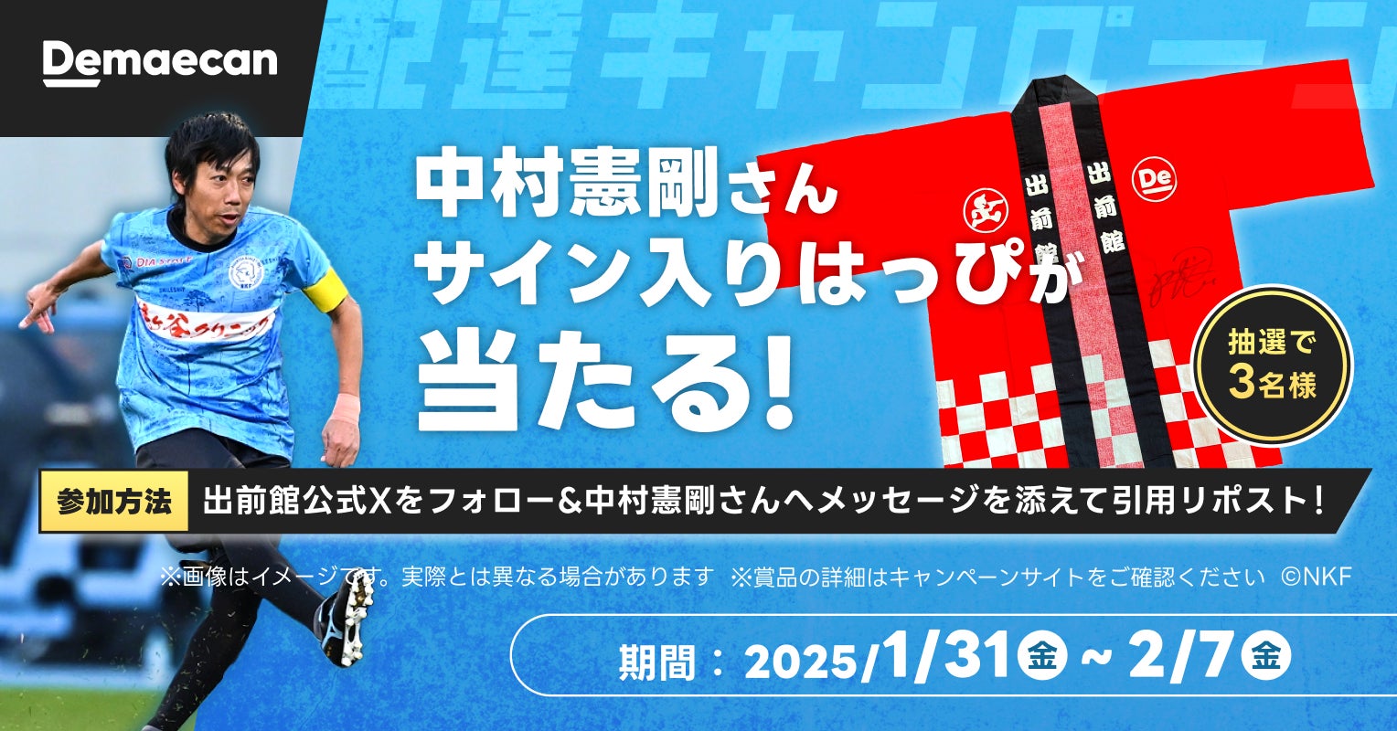 本キャンペーンを記念して、出前館公式X(@demaecan)をフォロー&該当ポストを引用して中村憲剛さんへのメッセージを添えて引用リポストしていただいた方の中から、抽選で3名に中村憲剛さんのサイン入りはっぴが当たるSNSキャンペーンを実施いたします。