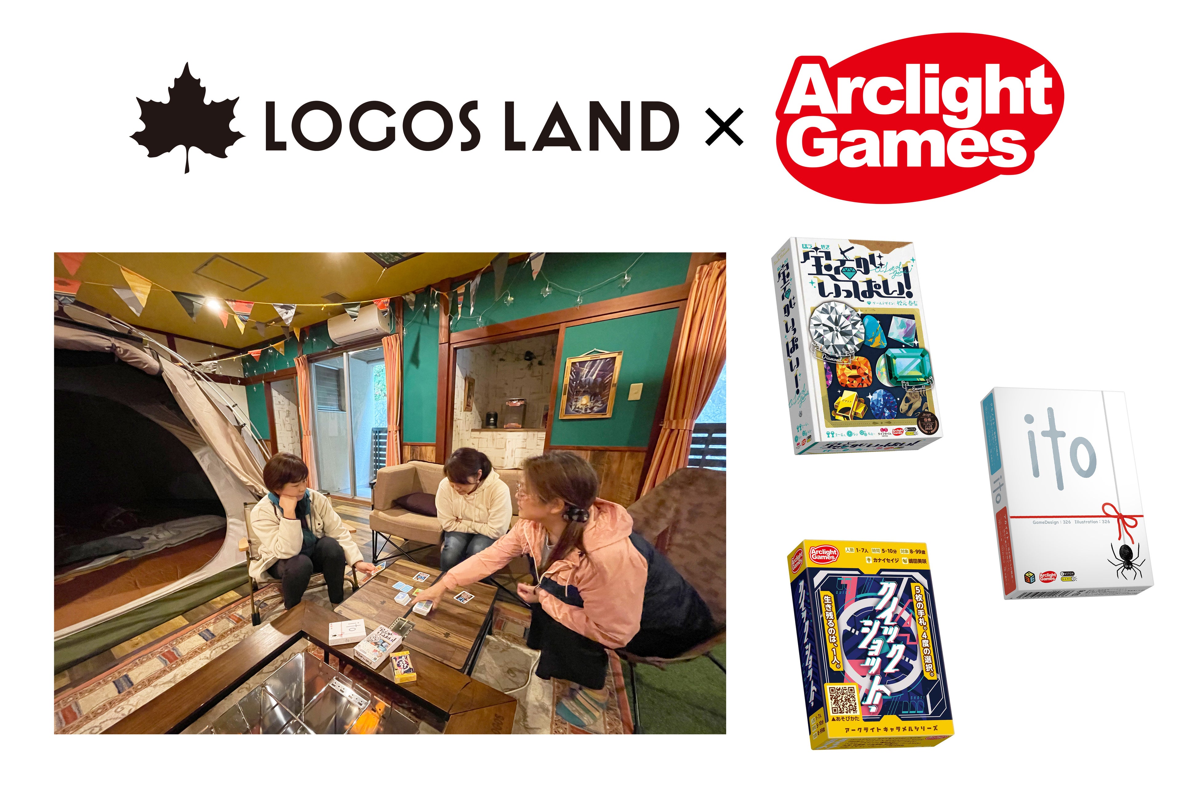 株式会社ロゴスコーポレーション(本社:大阪市住之江区、代表取締役社長:柴田茂樹)が展開するアウトドアブランドの「LOGOS」は、総合アウトドアレジャー施設『LOGOS LAND』(京都府城陽市)にて、株式会社アークライト(本社:東京都千代田区、代表取締役:福本皇祐)の特別協力のもと、2022年11月26日(土)から2023年2月28日(火)までの期間、人気ボードゲームが客室で楽しめる特別イベント「ボードゲームであったかキャンプ体験」を開催いたします。
