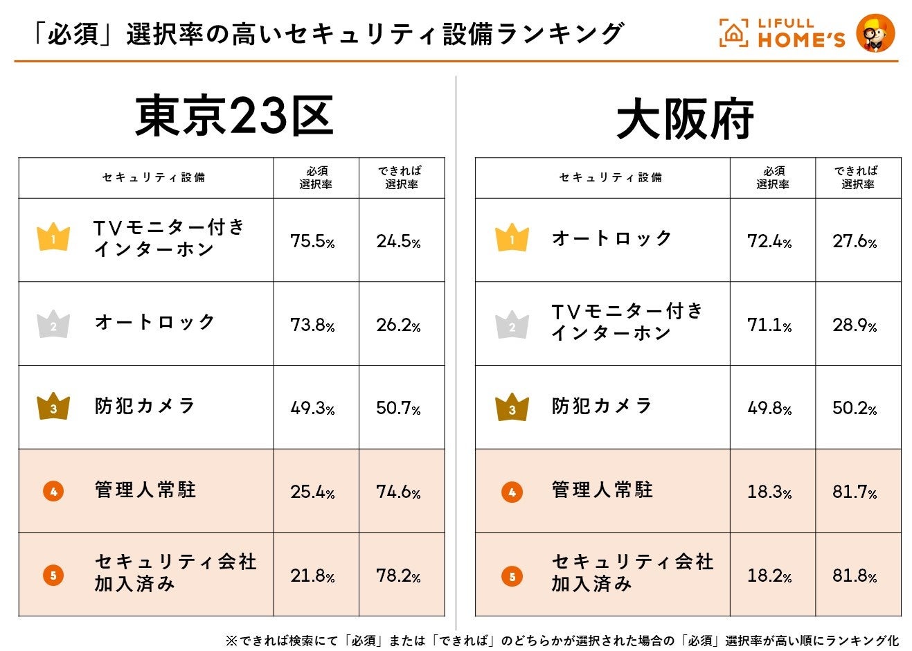 「必須」選択率の高いセキュリティ設備ランキング:東京23区の1位は「TVモニター付きインターホン」、大阪は「オートロック」