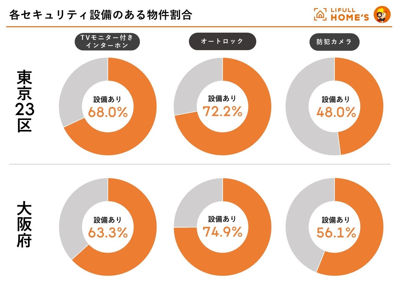 各セキュリティ設備のある物件割合:「オートロック」は東阪ともに7割超、東京23区は「防犯カメラ」が過半数を下回る