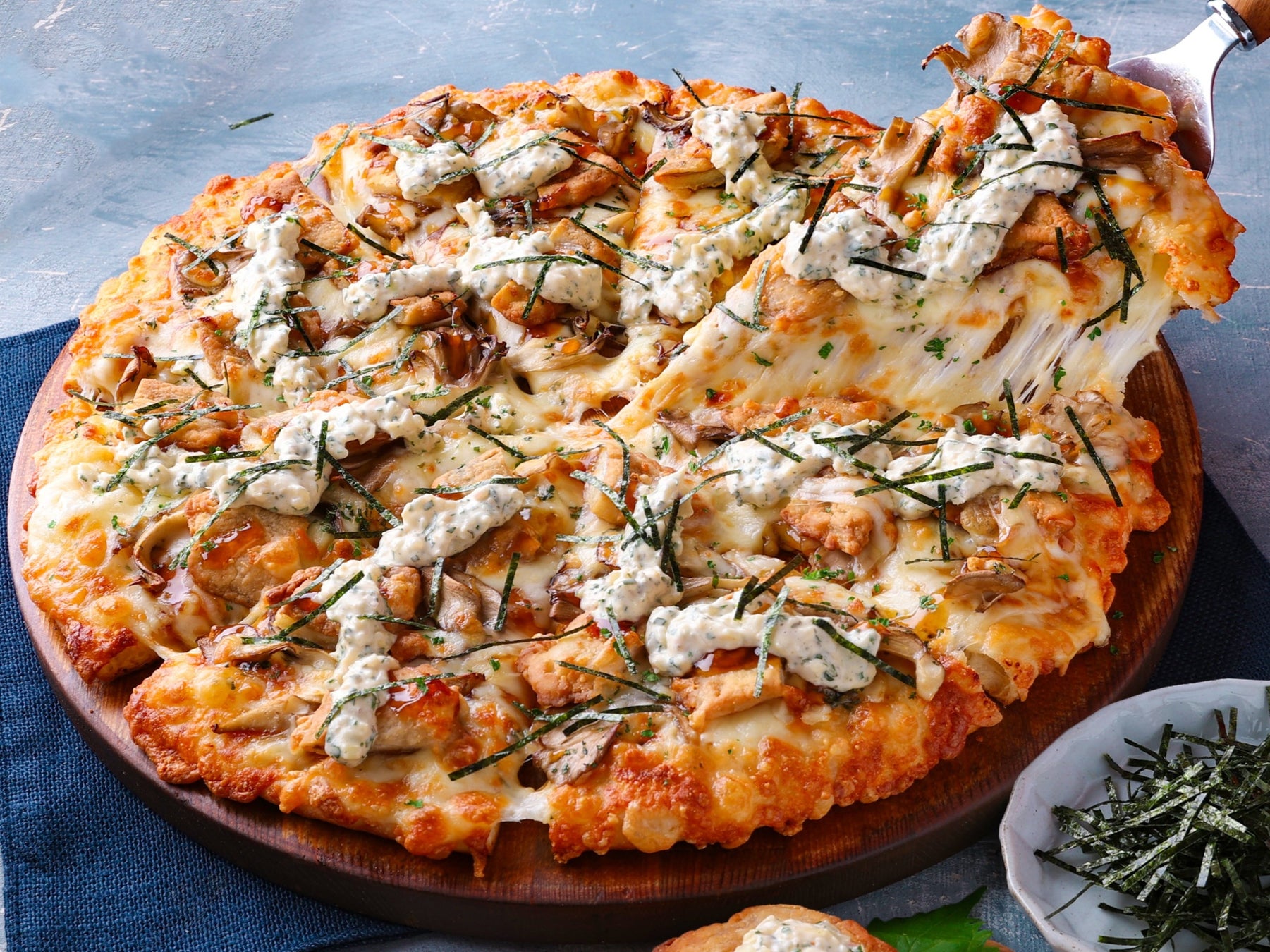 県産食材の太刀魚と海苔を中心として、ピザーラ自慢のテリヤキソースに大葉、舞茸、オニオンなどを合わせました。