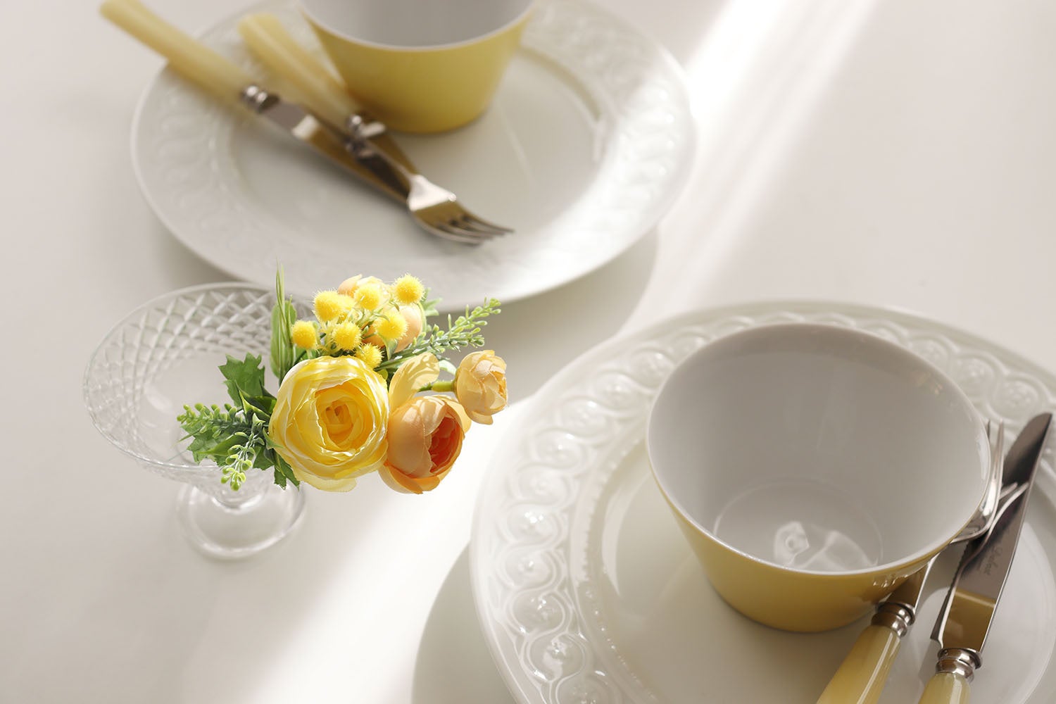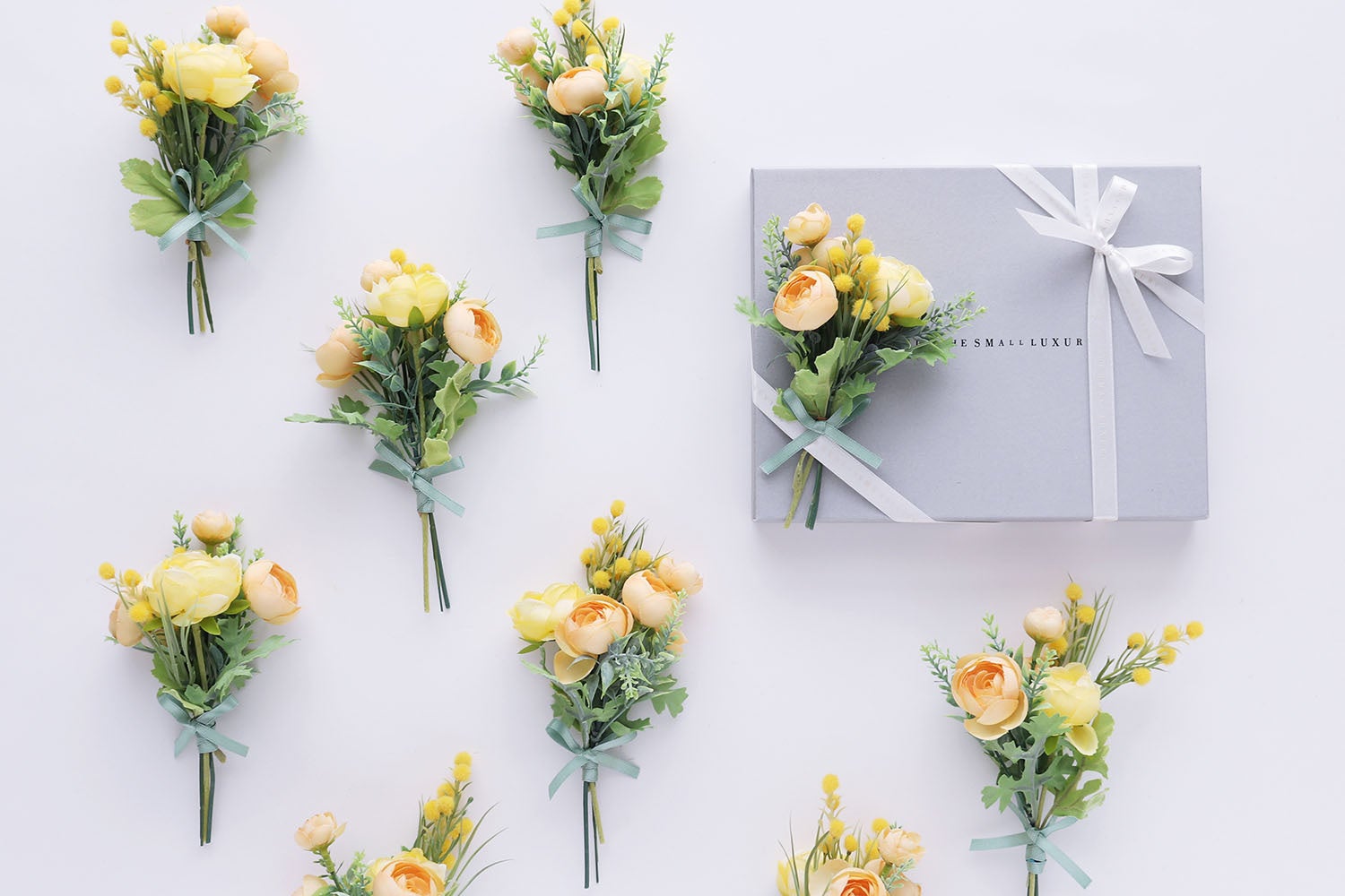 セットに添えられるミニブーケは、フラワーショップにオーダーして一つずつ丁寧にお作りしました。アーティフィシャルフラワーなので、花瓶や小さなグラスに飾って食卓や洗面スペースで気兼ねなくお楽しみいただけます。