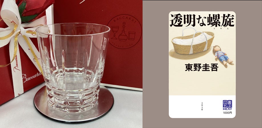 最優秀賞受賞者1名には、東野さんによる短篇小説執筆のほか、副賞としてオリジナル刻印入りバカラグラスや特製図書カードNEXT(5000円分)も贈られます。また優秀賞5作も選出し、特製図書カードNEXT(5000円分)をお贈りします。