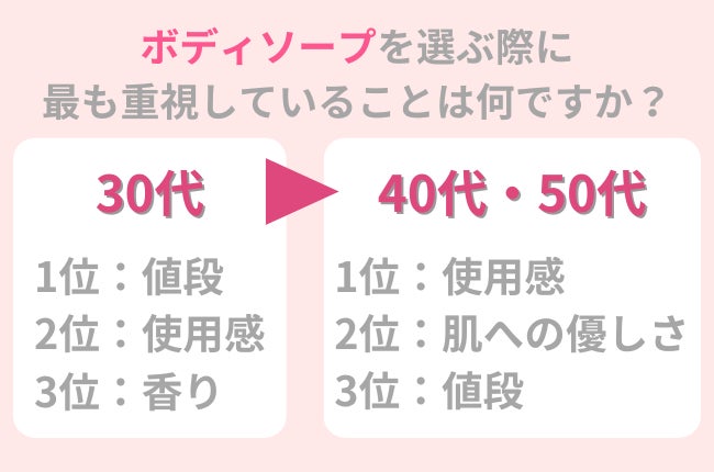調査の結果、30代女性のうち最も多くの方が「値段」でボディソープを選んでいる一方で、40代・50代の方は「使用感」で選んでいることがわかりました。