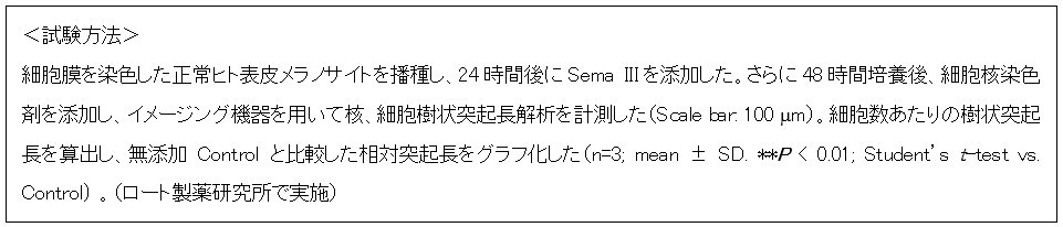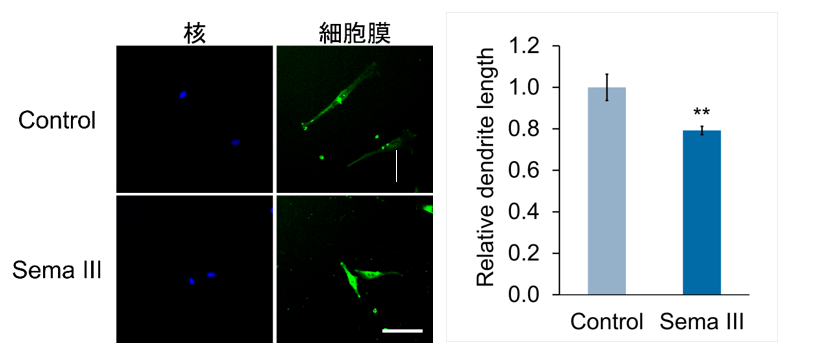 Sema-plexinシグナルのメラノサイトでの作用を調べるために、培養メラノサイト※5を用いた評価を行いました。PLXNA1のリガンドであるSema-3A(以下、Sema III )をメラノサイトに添加したところ、メラノサイトの突起伸長を有意に抑制する結果が得られました(図2)。