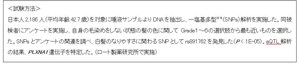 ロート製薬株式会社(本社:大阪市、社長:瀬木英俊)は、ロートグループ 総合経営ビジョン 2030「Connect for Well-being」の実現に向けて、白髪の根本的な改善方法の確立を目指した研究を進めています。今回、2,186人を対象とした大規模ゲノムワイド関連解析※1(以下、GWAS解析)を実施した結果、日本人特有の白髪関連遺伝子Plexin-A1※2(以下、PLXNA1)を世界で初めて発見しました。さらに、semaphorin(Sema)-plexinシグナル経路※3が白髪形成メカニズムに関与する可能性を明らかにしました。