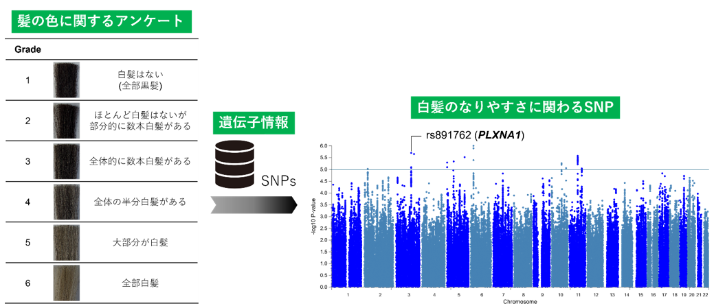 日本人2,186人を対象とした白髪に関するアンケートおよびGWAS解析を実施しました。結果、白髪との関連性の高い遺伝子として、PLXNA1遺伝子を確認しました(図1)。これまで神経系の発達に関わることが知られていたPLXNA1遺伝子が、白髪形成に関与する可能性を世界で初めて明らかにしました。