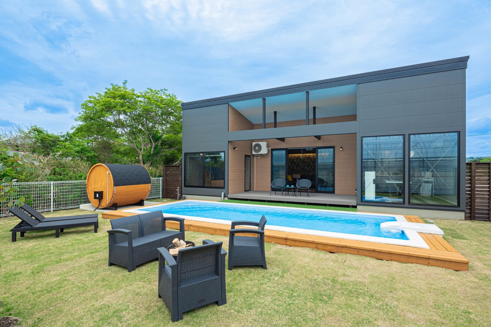 2棟限定で大型プライベートプールとバレルサウナをご用意。