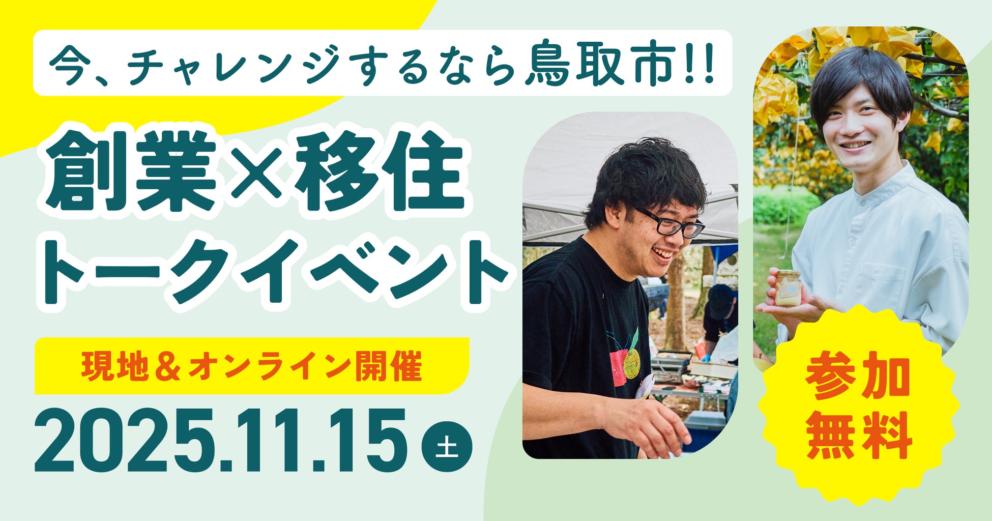 relay × 鳥取県「鳥取市創業・事業承継×IJUターンプロジェクト」の一環として開催される本トークイベントでは、先輩移住者や創業者のリアルな体験談、空き店舗や地域資源の活用事例などを通じて、鳥取市での新しい暮らしと働き方を描くきっかけをお伝えしていきます。