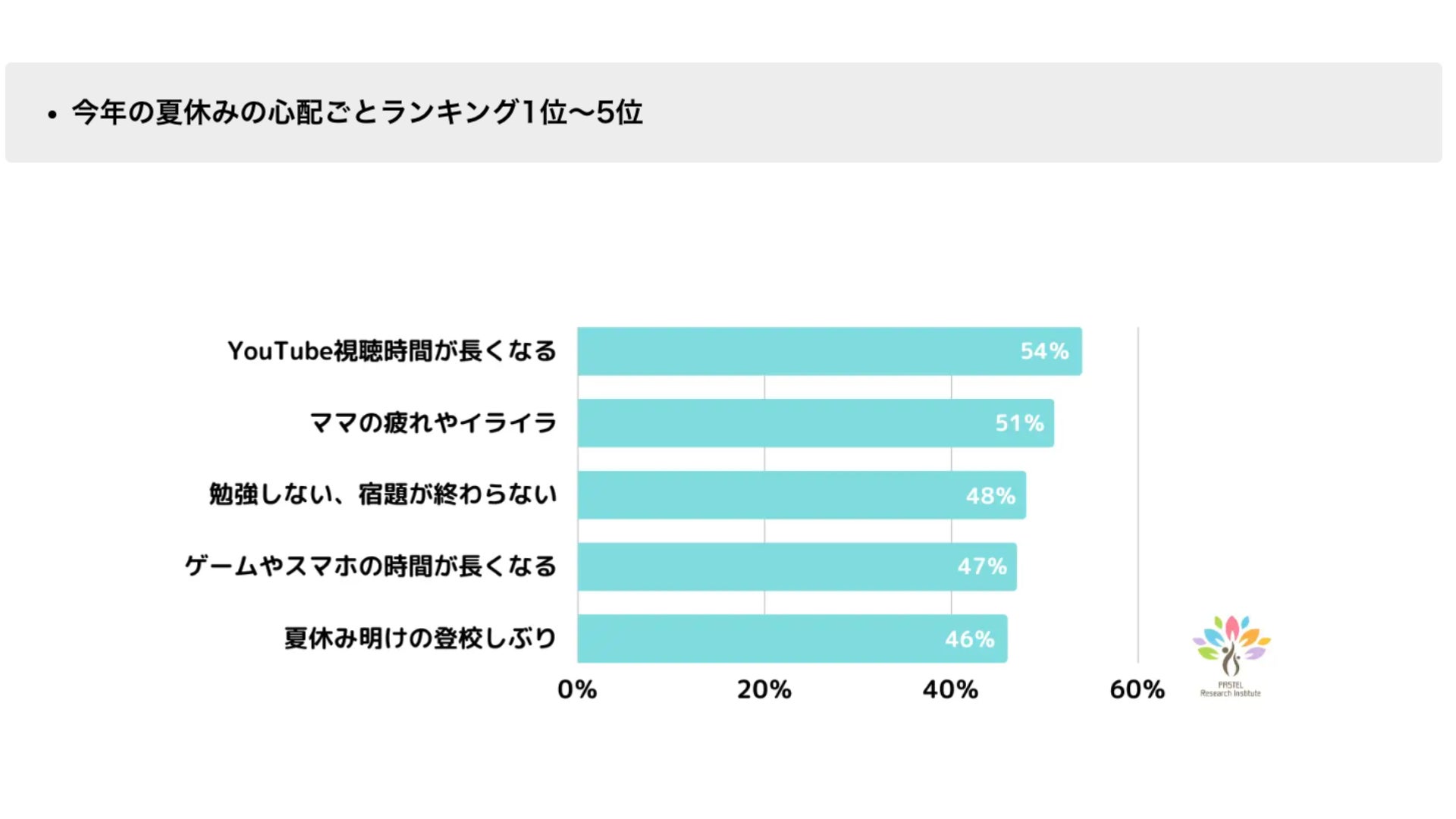 パステル総研が2023年に実施した夏休みのアンケートデータからもわかるように、回答者195名中の半数以上、54%のママが「YouTubeの視聴時間が長くなる」ことに悩みがあると回答しています。