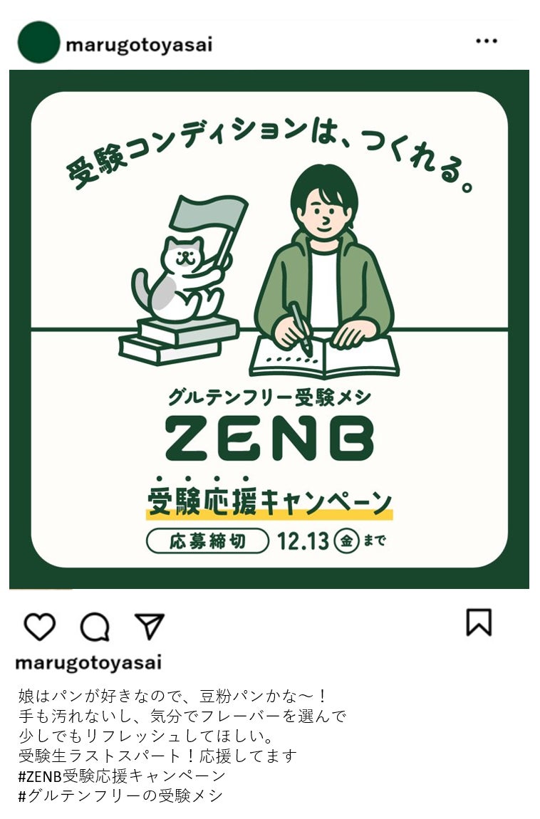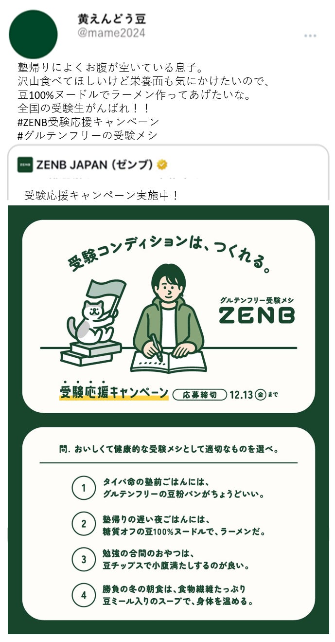 株式会社ZENB JAPAN(ゼンブ ジャパン)(愛知県半田市、以下ZENB)は、スーパーフード「黄えんどう豆」の栄養がまるごととれて、糖質コントロールもできる「グルテンフリー受験メシ」でコンディションを整え、試験本番に臨んでもらいたいという想いから、「ZENB受験応援キャンペーン」を2024年11月28日(木)から12月15日(日)まで開催します。「おいしくて健康的な受験メシ」に関する問題の解答をSNSに投稿した方の中から抽選で300名に、頑張る受験生の差し入れにぴったりなZENB商品やグッズの詰め合わせをプレゼントします。