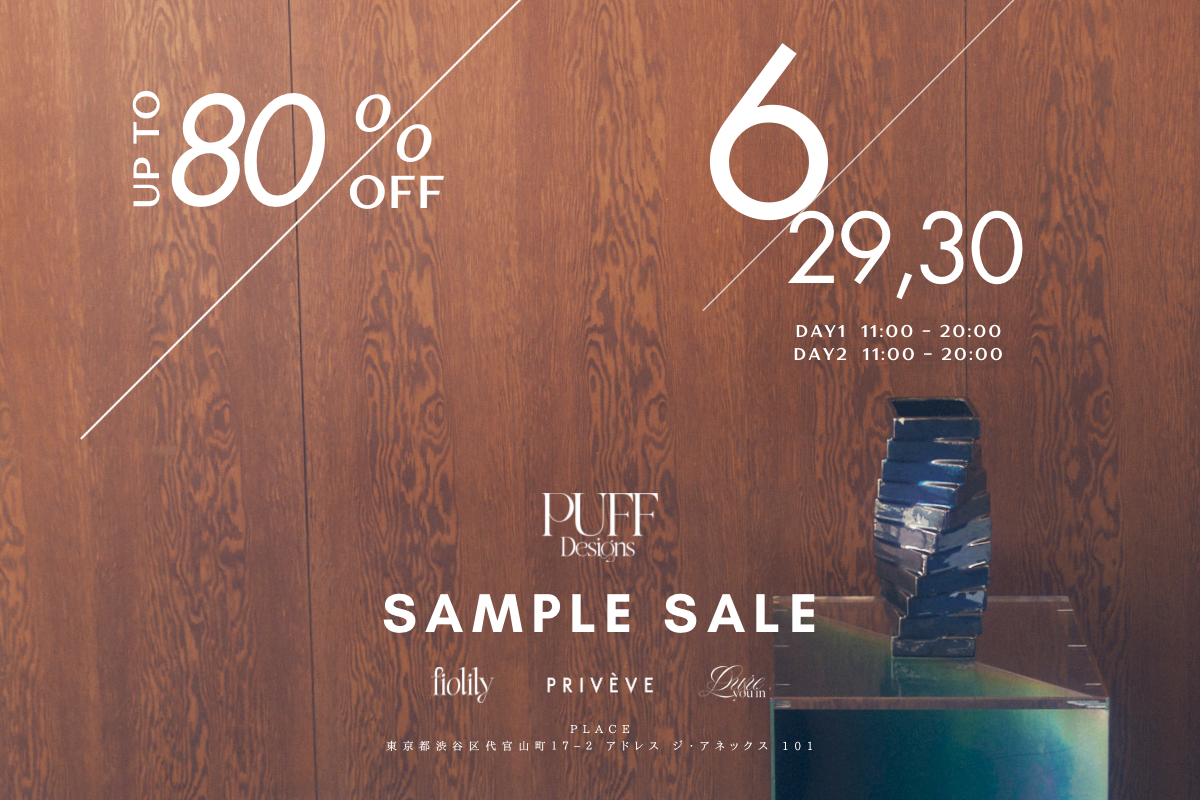 オンラインデパートメントストアのPUFF Designsが代官山にて、2024年6月29日(土)、30日(日)の2日間限定でサンプルセールを開催いたします。