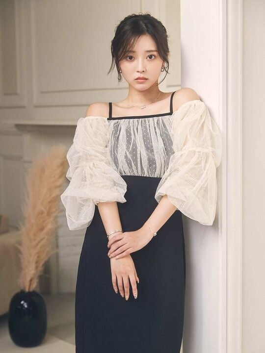 fiolily/ Dot Tulle Off Shoulder Dress