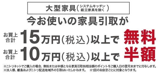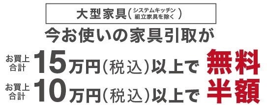 大型家具(お客様組立家具、システムキッチンを除く)のご購入で引取料通常4,400円(税込)をお得にご提供。