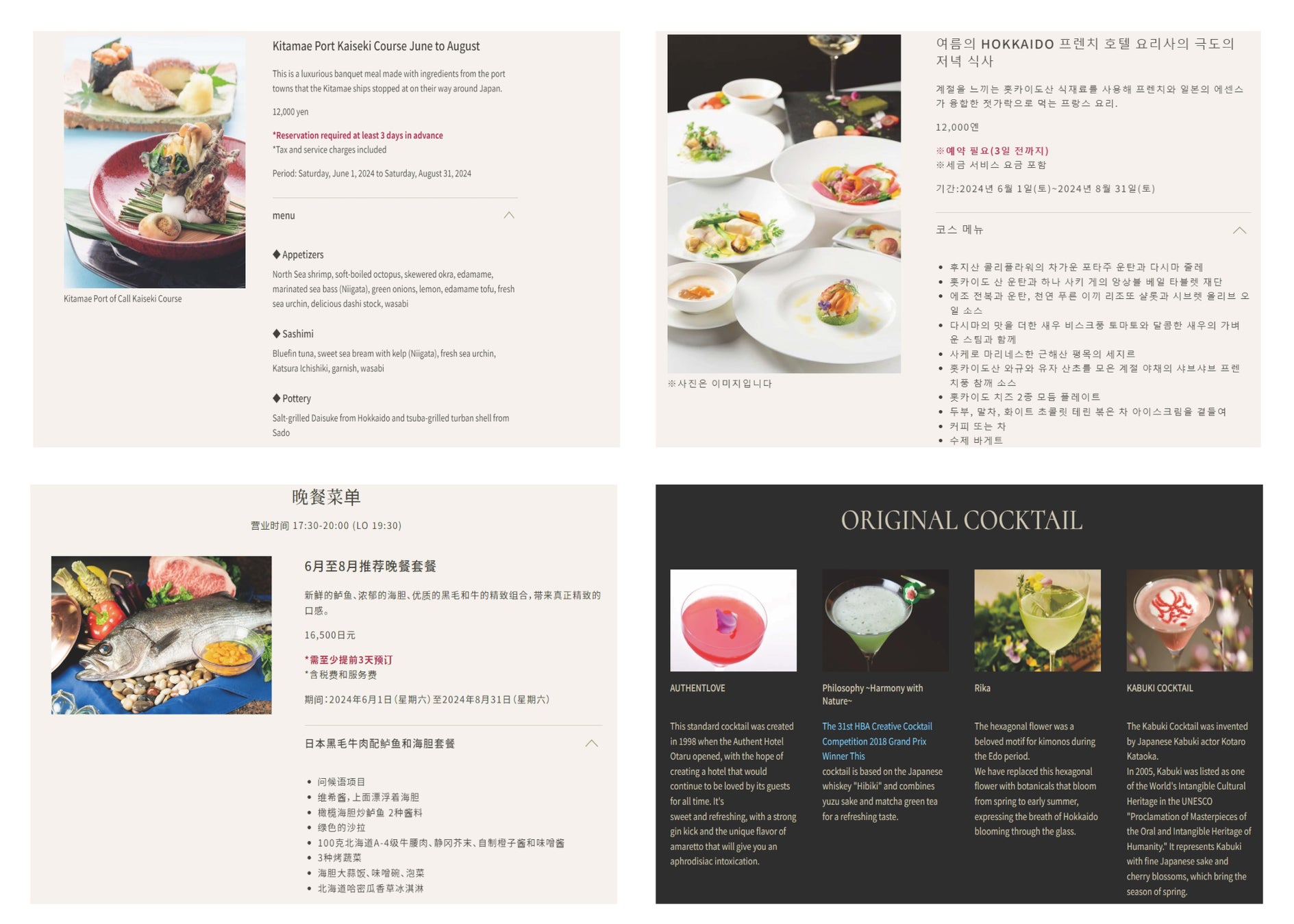 レストラン・バーのメニューや館内施設の詳細まで他言語対応が可能であり、海外からのお客様にはなじみがない日本料理やオリジナルカクテルについても詳細をご確認いただけます。また、ホームページからインターネット予約が可能となり一層利便性の高い構成になっております。