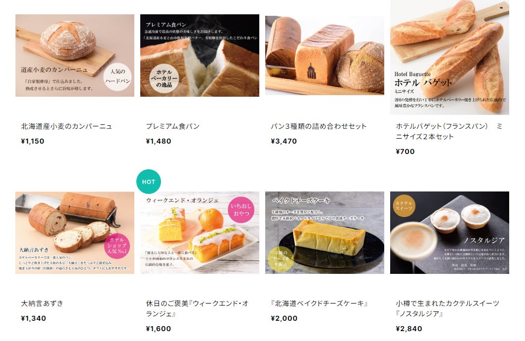 ベーカリー「オンディーヌ」で焼き上げたホテルメイドのパン・焼き菓子やレストランで作った食品を、BASEを利用した自社ECサイト、楽天、楽天ふるさと納税、さとふるで販売しており、北海道食材で丁寧に作った商品をご自宅までお送りいたします。ホームページ上から各サイトにアクセスできます。