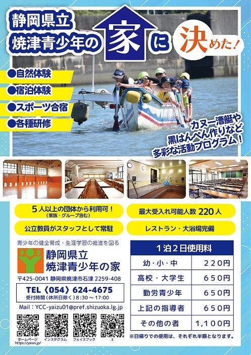 駿河湾に面した焼津石津浜に隣接する静岡県立焼津青少年の家で、自然を肌で感じながら体験学習や合宿、研修を計画してみませんか。