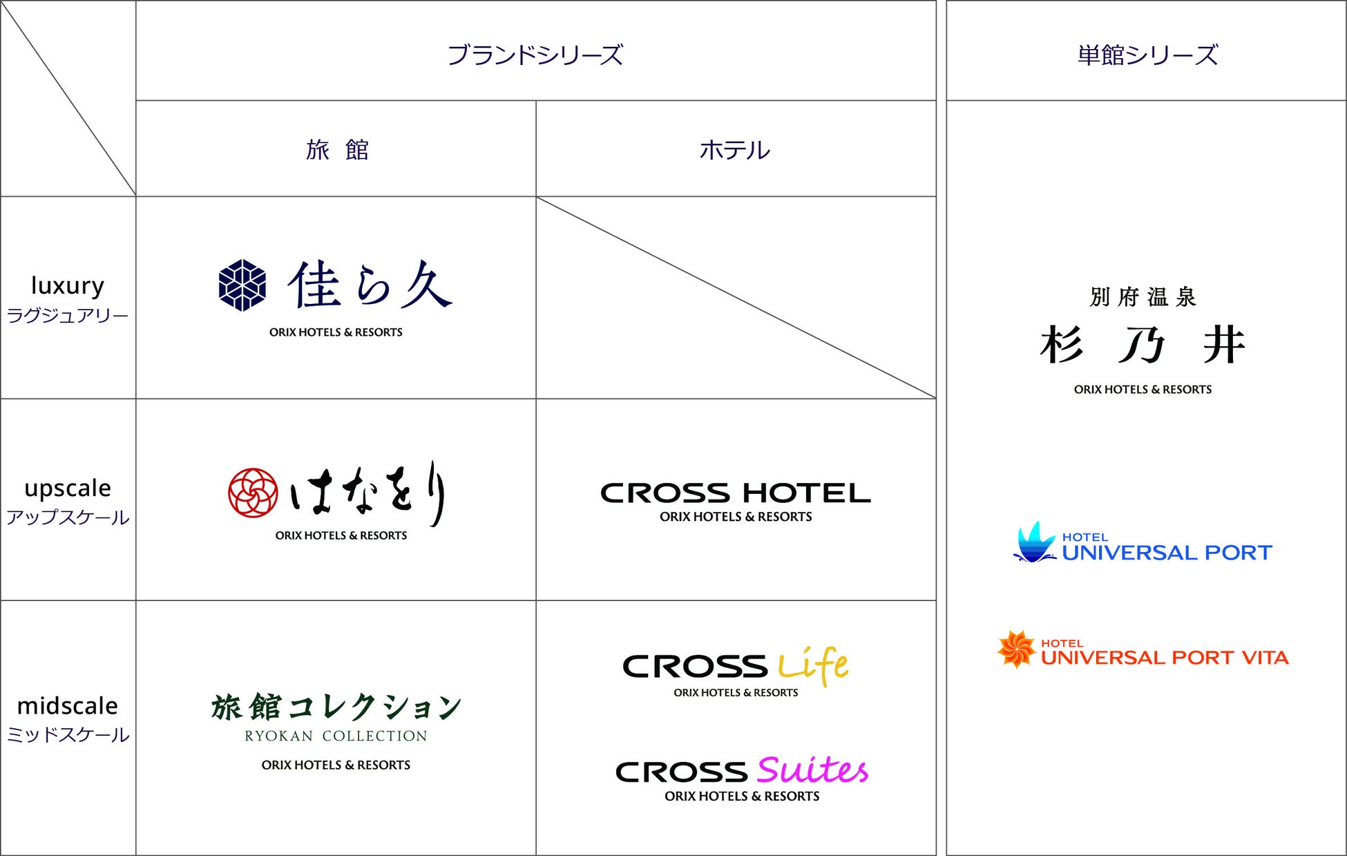 ORIX HOTELS & RESORTSは、オリックス・ホテルマネジメント株式会社の旅館・ホテルの運営事業ブランドです。ラグジュアリーからカジュアルまで、旅館とホテルを両軸に幅広いカテゴリーを有し、「また行きたい、と思っていただける場所。」をご提供するべく、お越しいただく皆さまのさまざまなライフステージに合わせた体験をお届けしています。2026年夏には「クロススイーツ東京浅草」を新規開業予定で、北は北海道から南は福岡、大分まで計6ブランドにて15の旅館・ホテルを展開してまいります。