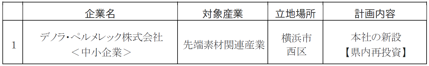 ・デノラ・ペルメレック株式会社は、横浜市企業立地促進条例に基づく事業計画の認定も受けています。
