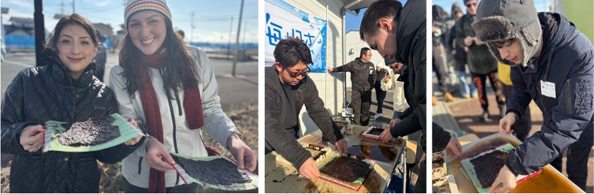参加者にとっては初めての体験でしたが、漁師さんからのアドバイスを受けながら、一枚一枚の海苔づくりに真剣に取り組んでいました。普段口にしている海苔は機械で作られていることがほとんどですが、今回昔ながらの方法で海苔すきを体験したことで、何気なく食べている海苔への見方が変わり、食材への感謝の気持ちが自然と深まる時間となりました。