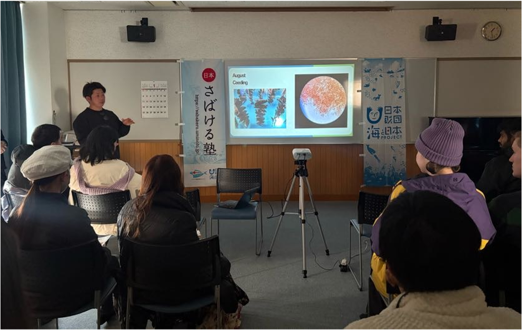 講座の中では、東松島市の海洋環境や海藻についてなかなか聞くことのできない現場ならではのお話を伺い、海苔養殖については、その生育環境や養殖の工程についても座学を展開。さらには海の環境が与える影響など、普段の生活では意識しにくい内容を学ぶことができました。特に自然条件や人の手の加え方によって養殖の状況が大きく左右されることなど、具体的な話には参加者も関心を示して耳を傾けていました。この講座を通して、身近な食材である海苔が多くの人の手と自然の力によって支えられていることを知り、改めて海の恵みの大切さを感じる機会となりました。そして、参加者は講師の話を通じて、日本の海や食文化への理解を深めている様子でした。
