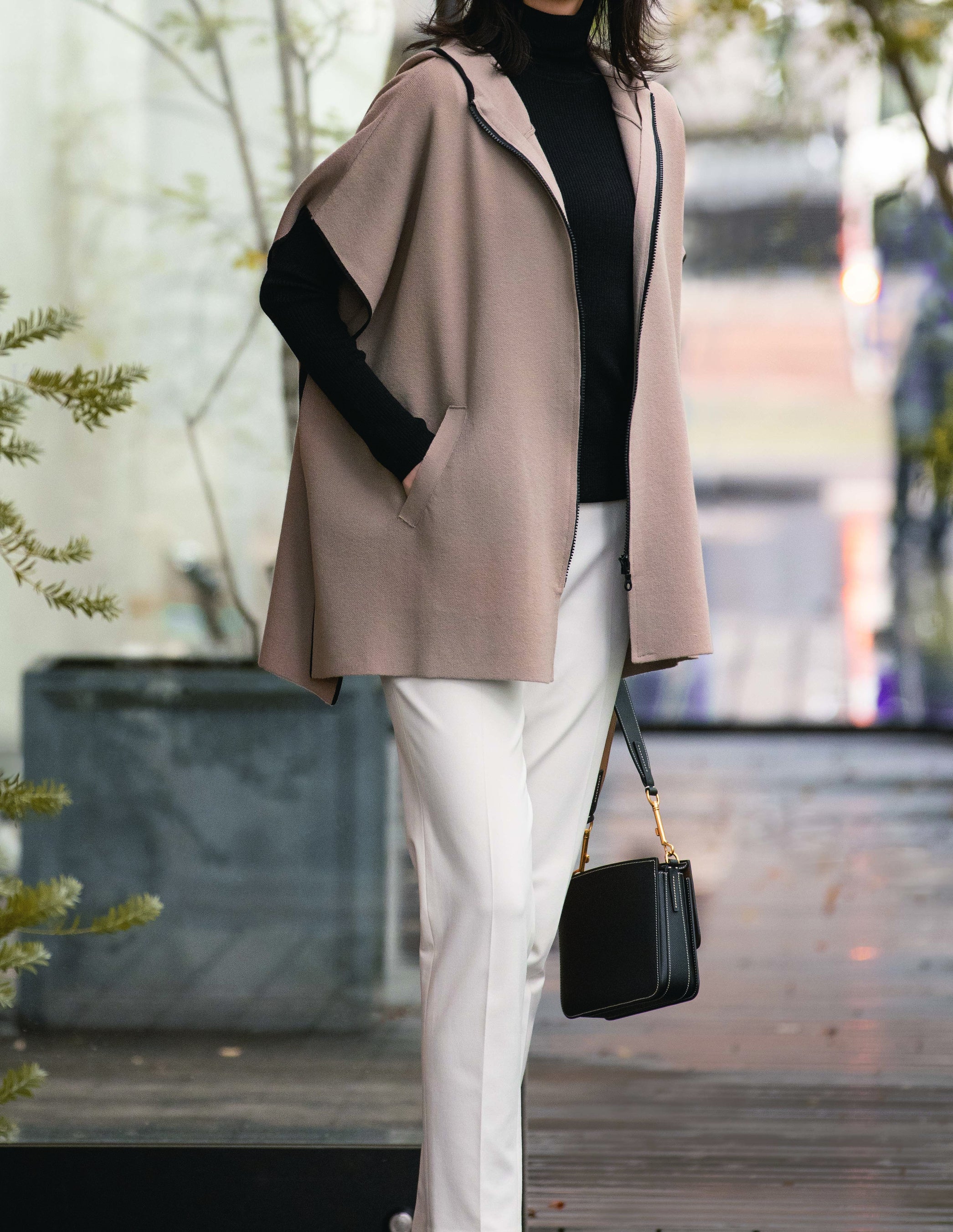 ジレとポンチョをミックスしたようなニットアイテムを紹介します。